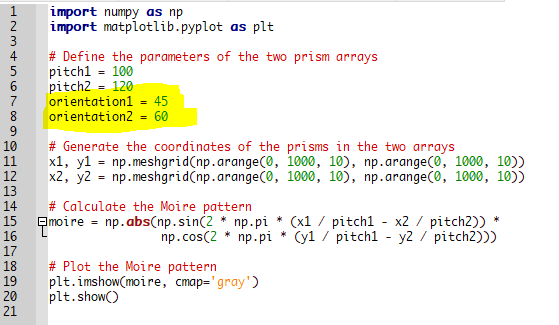 can you make python code to simulate Moire pattern by two prism arrays which have different pitches and orientations?